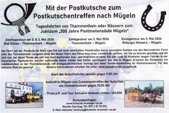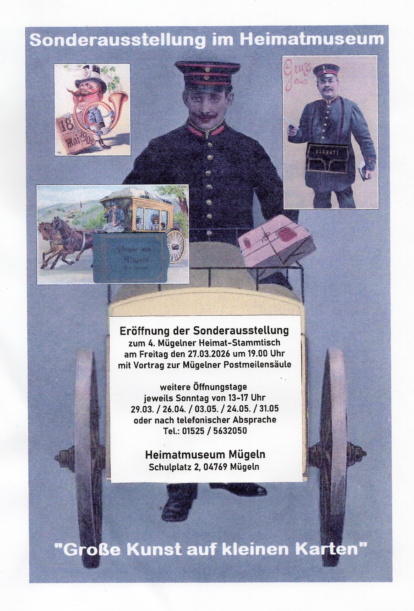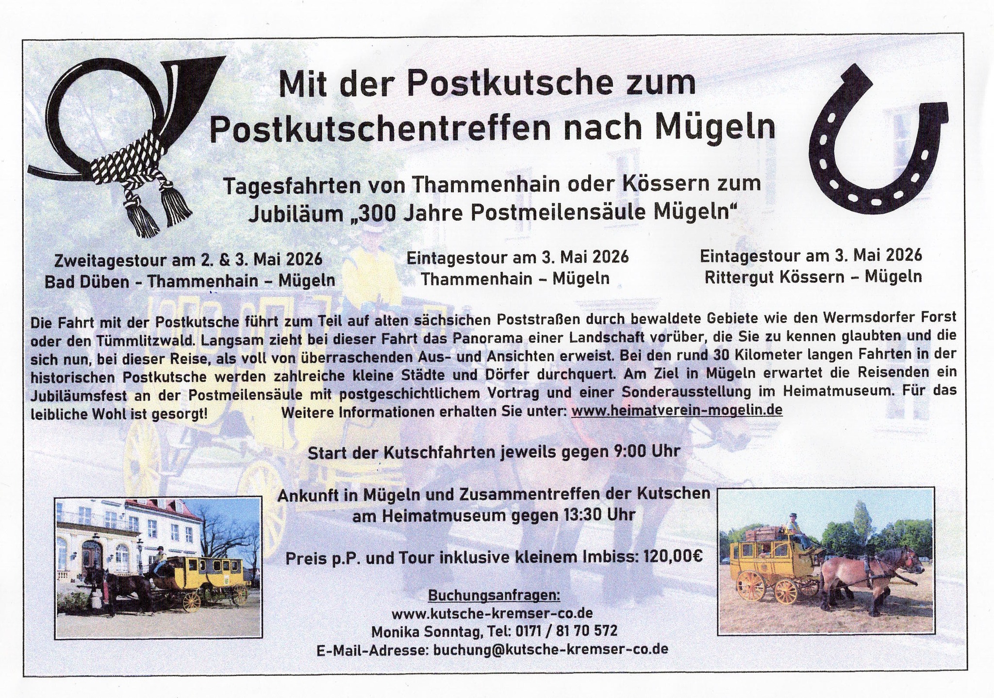 Aus diesem Anlass werden am 2. und 3. Mai in Mügeln Postkutschenfahrten angeboten und am 27.März hält André Kaiser einen Vortrag zur Geschichte der Mügelner Postmeilensäule.